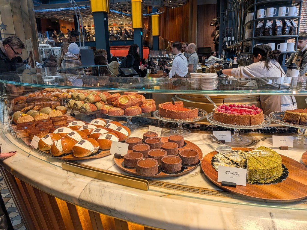 店内はどこを切り取ってもスタイリッシュ。 ミラノ限定のタンブラーや洗練されたグッズ、そして美しくディスプレイされた焼きたてのペストリーは、見ているだけでもワクワクが止まりません。🥐🎶